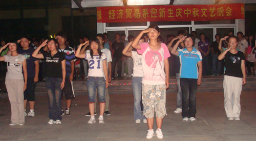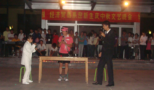 晚会在学院行政楼门前露天广场举行,经济贸易系06、07级同学为本台晚会准备了精彩的节目,表达了对家人的思念、对集体的热爱,更表达了对08级新同学的欢迎,体现了学兄学姐们对学弟学妹们的关心。08级投资与理财专业的同学在晚会上表演了集体节目 ――《感恩的心》,以此表达对学院、对系领导、对老同学的感谢。晚会上新老同学积极互动,吃月饼、赏明月,猜谜语等,其乐融融。