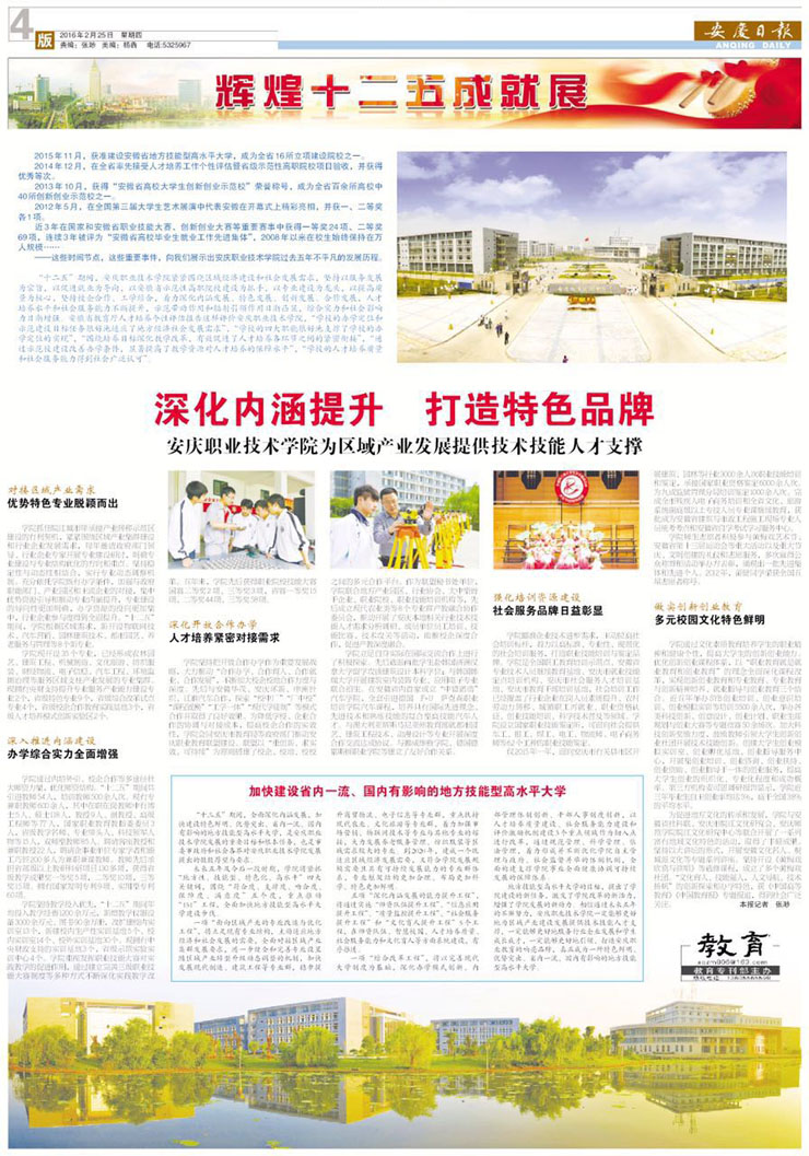 2016年2月25日,《安庆日报》“辉煌十二五成就展”栏目以《深化内涵提升 打造特色品牌 taptap点点官方网站为区域发展提供技术技能人才支撑》为题,专题报道我院“十二五”时期改革发展情况,并介绍我院“十三五”时期加快建设地方技能型高水平大学的思路和举措。