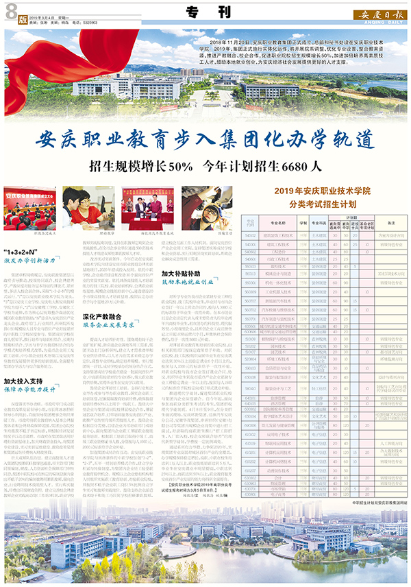 2018年11月20日,安庆职业教育集团正式成立,总部和秘书处设在taptap点点官方网站。2019年,集团正式施行实体化运作,将开展院系调整、优化专业设置、整合教育资源,推进产教融合、校企合作,促进职业院校招生规模增长50%,加速加倍培养高素质技工人才,鼓励本地就业创业,为安庆经济社会发展提供更好的人才支撑。