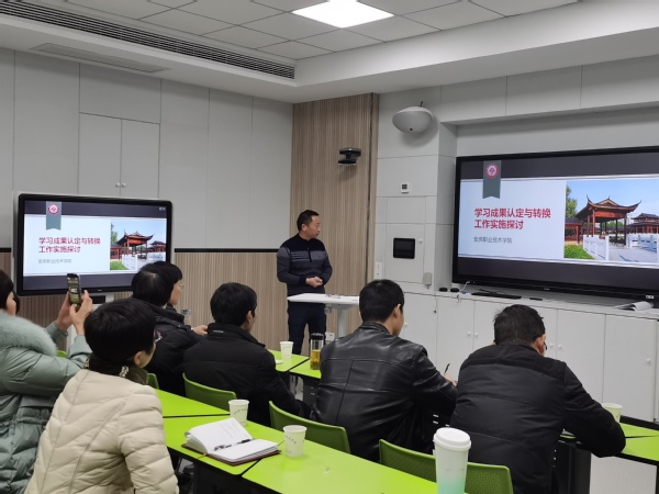 计算机应用技术专业负责人王奇志老师作《高职扩招学习成果认定与转换工作实施探讨》专题报告,从扩招教学工作的必要性、工作流程实施、认定和互换内容等方面开展具体说明和例证。与会人员就学制灵活与教学管理、严格毕业要求与学生上课等问题进行沟通交流。