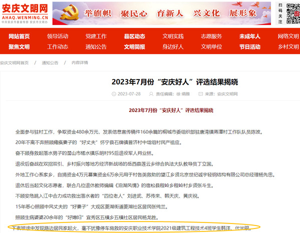 近日,从安庆市文明办获悉,经过推荐、审核、评审等程序,7月份“安庆好人”评选结果揭晓,点点官网建筑工程学院2021级建筑工程技术4班学生韩洋、代光银双双入选。
