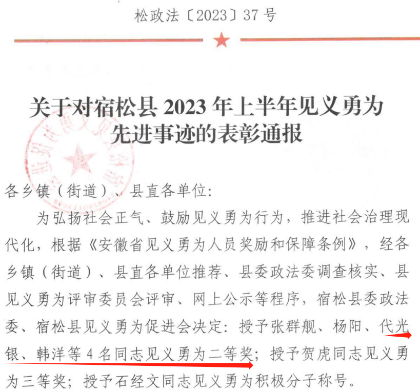 为弘扬社会正气、鼓励见义勇为行为,近日,宿松县政法委、宿松县见义勇为促进会对宿松县2023年上半年见义勇为、先进事迹进行了表彰通报,点点官网建筑工程学院2021级建筑工程技术4班学生代光银、韩洋被授予见义勇为二等奖。