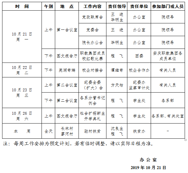 2019-2020学年第一学期第9周(10.21-10.27)工作安排