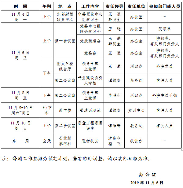 2019-2020学年第一学期第11周(11.4-11.10)工作安排