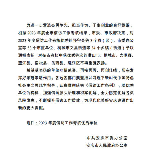 | 点点官网荣获“2023年度全市信访工作优秀单位”称号 |