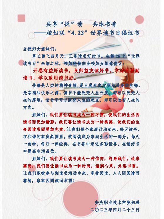 共享“悦”读 共沐书香 校妇联“4.23”世界读书日倡议书