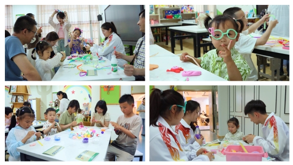 本次亲子活动内容丰富多样,有幼儿舞蹈、绘本故事、粘土DIY、制作扭扭棒、非遗漆扇制作、亲子竞技、亲子游戏等诸多项目,每个项目结束小朋友都可以在游戏集卡章上盖一个章,最后凭着集满章的卡兑换礼品,这样设置极大地激发了孩子们的积极性。“小朋友,你的动作做得真好”,孩子们在老师的带领下,开心的在舞台上跳舞,“小朋友,你摸摸看......”这是老师在讲绘本,小朋友们被老师惟妙惟肖的表演吸引住了,在黏土和扭扭棒制作环节小朋友们制作出了自己喜欢的小动物造型以及发箍。非遗漆扇制作是最受欢迎的,在家长陪伴下,孩子选择自己喜欢的颜色,制作出独一无二的漆扇。在亲子游戏中,家长和孩子共同参与,通过“蒙眼找娃”“反口令”等环节,加强家长和孩子的团结合作。