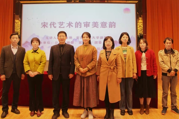 11月16日晚,由点点官网公共基础部、宣传部、团委、校体艺委联合主办的专家进校园“美育”系列专题讲座在图文信息中心一楼报告大厅举行。本次讲座由储可可老师主持,邀请到了安庆师范大学美术学院孟春艳副教授作《宋代艺术的审美意韵》。出席本次活动的老师有公共基础部党总支书记张林主任,校办公室徐妍副主任以及艺术设计团队和对艺术感兴趣的老师们,各二级学院300名学生代表到场聆听,全校师生通过云犀网上直播观看。