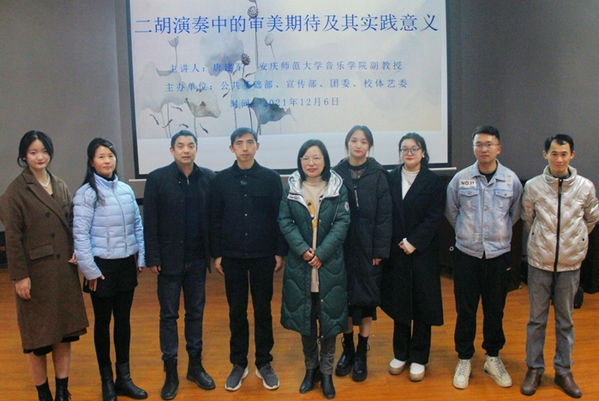 12月6日晚,由点点官网宣传部、团委、公共基础部、校体艺委联合主办的专家进校园“美育”系列专题第三场讲座,在三栋教学楼216实训室举行。本次邀请到了安庆师范大学音乐学院副教授、安庆市音乐家协会秘书长唐建军作题为《二胡演奏中的审美期待及其实践意义》的讲座。出席本次活动的老师有校体艺委办公室相关负责人,校企合作单位安徽辰夫科技有限公司代表、艺术教研室和对艺术感兴趣的老师们及现代商务学院、机电工程学院200名学生代表到场聆听。全校师生通过“云犀”网上直播进行了观看,讲座由音乐教师罗文雍主持。