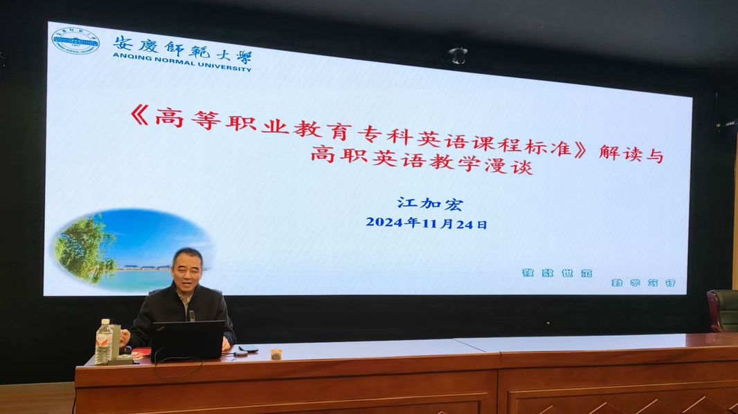 为深入理解《高等职业教育专科英语课程标准》,进一步促进学生英语学科核心素养的发展。11月24日晚,在图文信息中心三楼报告厅,公共基础部邀请了安庆师范大学外国语学院院长江加宏教授作了题为《高等职业教育专科英语课程标准解读与高职英语教学漫谈》的专题讲座,讲座由校科技处副处长王伟主持,公共基础部部分英语教师和农林与服装学院80余名学生代表聆听了讲座。