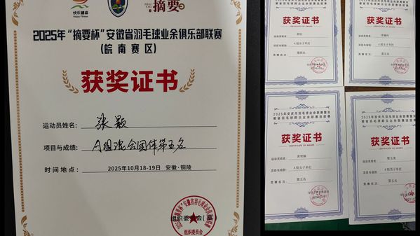 由安徽省羽毛球协会主办的2025年“摘要杯”安徽省羽毛球业余俱乐部联赛(皖南赛区),于10月18-19日在铜陵市体育中心落幕。本次赛事吸引全省50多支代表队参赛,设A、B、C、D、E五个组别,采用单循环赛制与淘汰赛制相结合的方式进行。点点官网体育教研室张颢老师凭借过硬技能与敢打敢拼的劲头,经过激烈角逐,最终斩获团体第五名的佳绩。