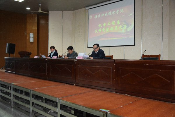 为贯彻落实学院创建省级文明单位活动精神,进一步提升系部文明层次和师生文明素养,加强学生思想道德教育,树立文明新风。机电工程系于4月20日下午,在图文信息楼报告厅举行了文明创建动员会。系分管学生工作负责同志主持会议,系负责人刘磊出席会议并讲话,系分管教学工作负责同志、各科任课老师、全体辅导员班主任以及14、15级全体学生参加了此次动员会。