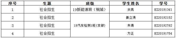 机电工程学院2019级新能源班(扩招桐城)学生余亮,2019级汽车检测与维修1班(扩招本部)姜立涛、朱清,方正一直未参与规定的教学活动,辅导员多次联系学生及其家人,未果。现根据《taptap点点官方网站社会扩招学生学籍管理实施办法(试行)》的相关规定,要求以上4位同学于2024年4月23日前务必联系辅导员参加规定教学活动,否则将依据《taptap点点官方网站社会扩招学生学籍管理实施办法(试行)》第二十六条规定,视为自动放弃学籍,按自动退学处理。