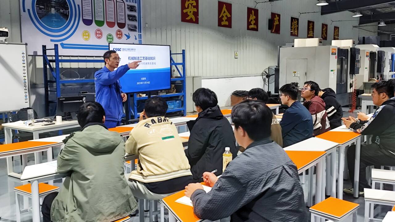 本次课程由机电工程学院精心组织,紧密结合订单班人才培养目标和企业实际需求,围绕机械产品从“材料选择—加工方法—工艺设计—质量控制—先进制造技术发展”的完整技术链条展开。王蔚鸿工程师依托多年扎根船舶动力装备制造一线的工程经验,将企业真实生产案例与课堂教学深度融合,把抽象的工艺理论转化为可感、可知、可应用的工程实践知识。