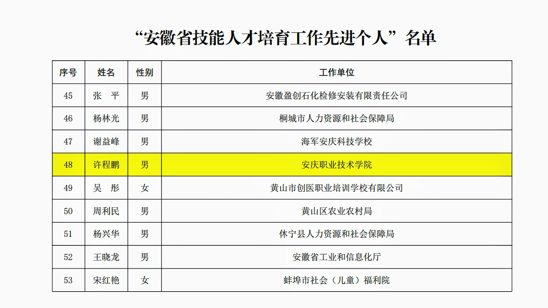 “安徽省技能人才培育工作先进个人”旨在表彰在技能人才培养工作中做出突出贡献的个人。获奖者许程鹏同志潜心执教,将新时代“工匠精神”融入育人全过程,在教学中他打破传统课堂壁垒,将企业真实项目、技术前沿动态融入课程,创造了“项目引领、分层递进”实操训练法,多次指导学生参与国家及省市级技能竞赛并取得优异成绩,培养出一批产业急需、技艺精湛的能工巧匠。