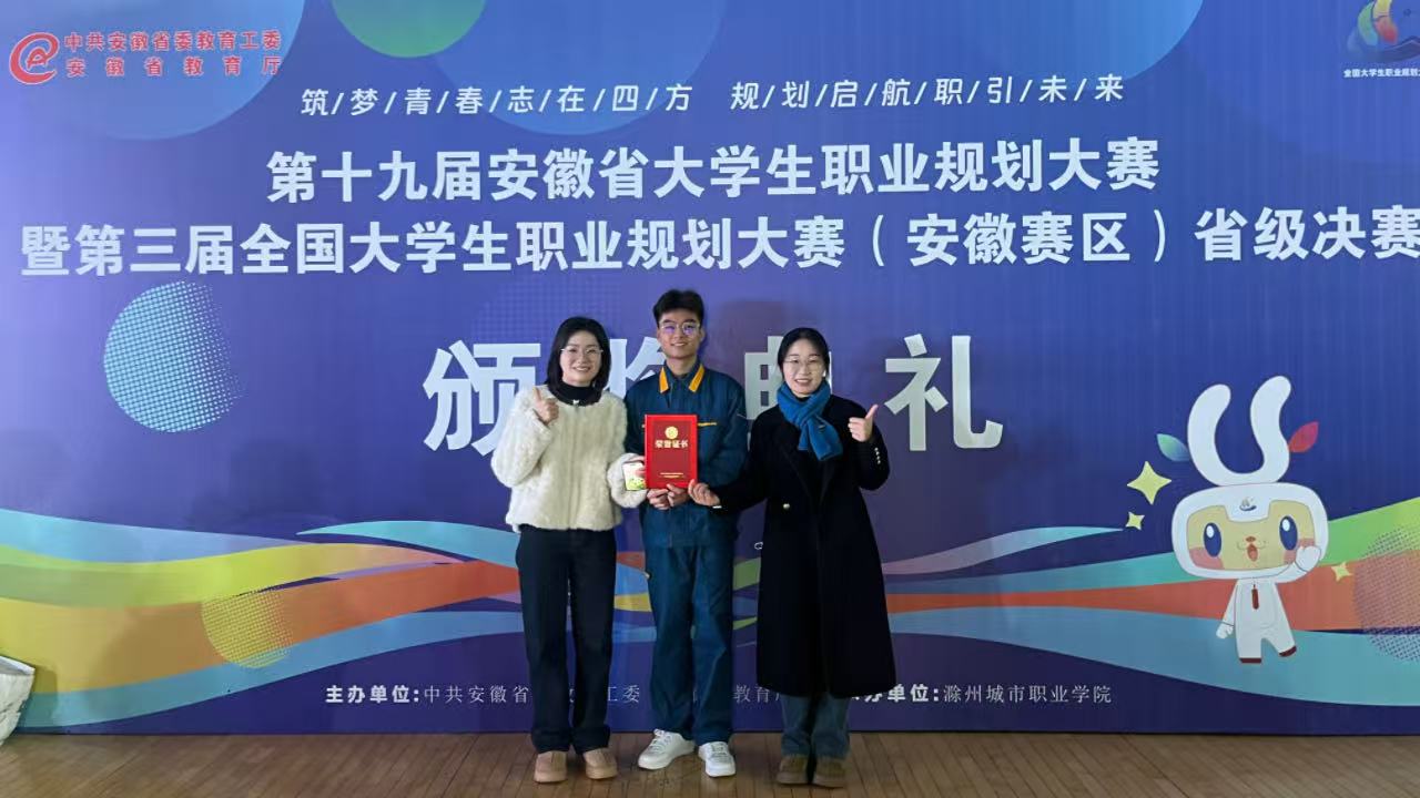 2026年1月17日,第十九届安徽省大学生职业规划大赛暨第三届全国大学生职业规划大赛(安徽赛区)决赛在滁州城市职业学院圆满落幕。点点官网机电工程学院韩信同学凭借清晰的职业规划、扎实的专业素养斩获成长赛道职教组金奖,管理服务学院刘敏杰同学荣获就业赛道职教组银奖,充分展现了点点官网学子卓越的职业规划能力与青春风采,为学校赢得了荣誉。
