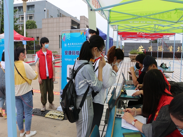 在学校统一安排下,同学们在进校入口处洗手消毒、行李消毒、更换口罩、查验证件,在志愿者的指引下完成身份核实、查验安康码、测量体温后领取出入证进入校园,整体工作平稳有序、安全高效。
