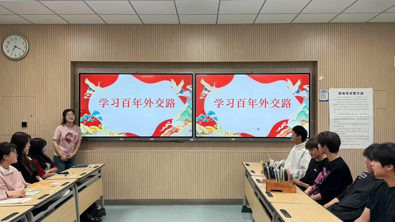 活动前期,团支书余姚分别以“新中国成立初期”“20世纪60年代”“20世纪70年代”“改革开放后”为时间线,通过借助PPT向同学们讲述起中国外交的百年脉络。同学们都在认真倾听。当PPT内容讲述完毕时,同学们也忍不住纷纷上台分享。王娅丽同学首当其冲以鸦片战争后的一系列不平等条约为切入点,重现了清末“量中华之物力,结与国之欢心”的屈辱场景,结合《马关条约》签订时李鸿章的无奈与挣扎,引发同学们对“弱国无外交”的深刻思考。紧接着霍昱宏同学根据最近的时事热点“乌克兰弱国无外交”做出分享,更让同学们体会到中国的来时路的不易。