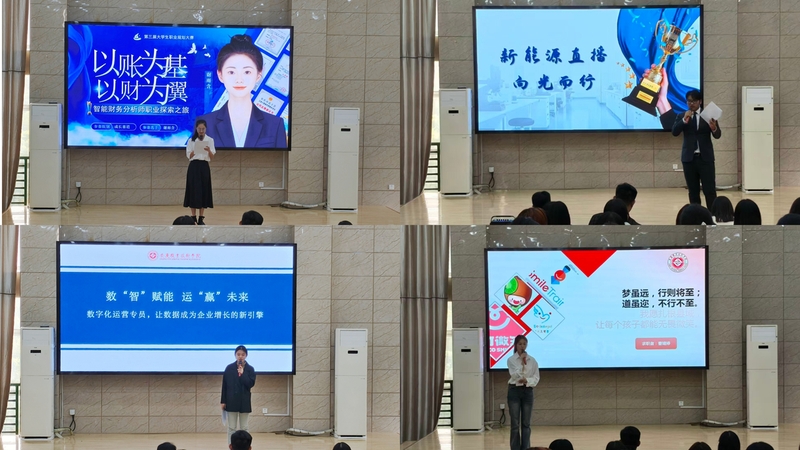 比赛现场,7名选手围绕自我认知、职业环境分析、职业目标设定、路径规划、评估调整等核心内容,通过PPT展示与现场答辩的形式,全面阐述个人职业生涯规划。有的选手聚焦行业领域前沿,将数字运营专员作为职业方向,结合行业发展趋势制定阶梯式成长计划;有的选手立足专业优势,瞄准智能财会岗位,通过实践经历与技能储备论证目标可行性;还有的选手结合乡村振兴战略,计划返乡投身农产品销售行业,将专业知识转化为服务地方发展的实际力量。选手们逻辑清晰的规划、自信从容的表达与贴合实际的职业构想,赢得了评委与现场观众的阵阵掌声。