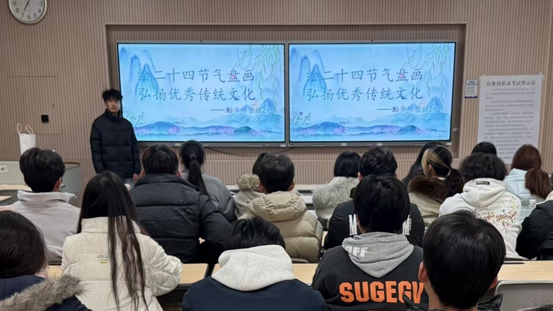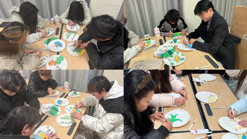 活动中,班级团支书讲解中国传统二十四节气的历史渊源与习俗故事,并普及盘画构图技巧与色彩搭配知识。创作环节,大家以纸盘为画布、水彩为笔,将节气元素与创意巧思相融:嫩绿柳枝配飞燕勾勒春分生机;金黄稻穗映圆月尽显秋分丰饶;傲雪寒梅伴落雪诠释冬至静谧……部分作品点缀节气诗词,兼具美感与文化底蕴。两小时后数十幅精巧作品完成,同学们相互交流构思,分享创作灵感与节气寓意。