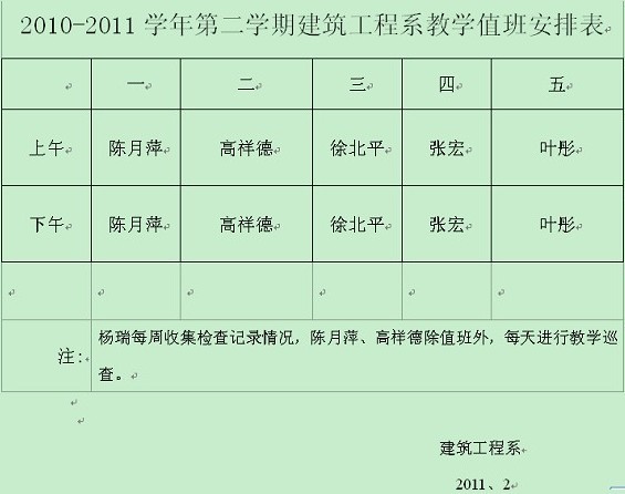 2010-2011学年第二学期建筑工程系教学值班安排表
