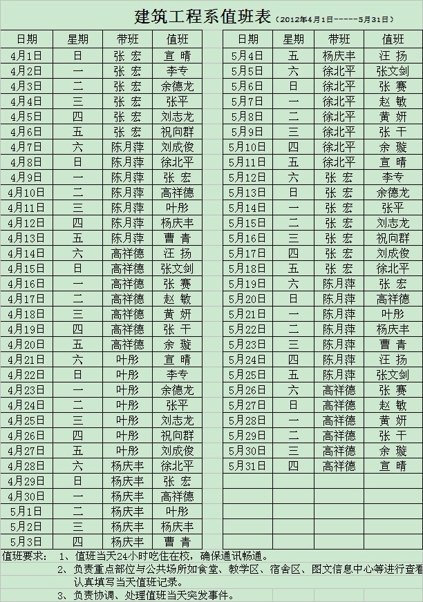 建筑工程系2012年4-5月值班安排表