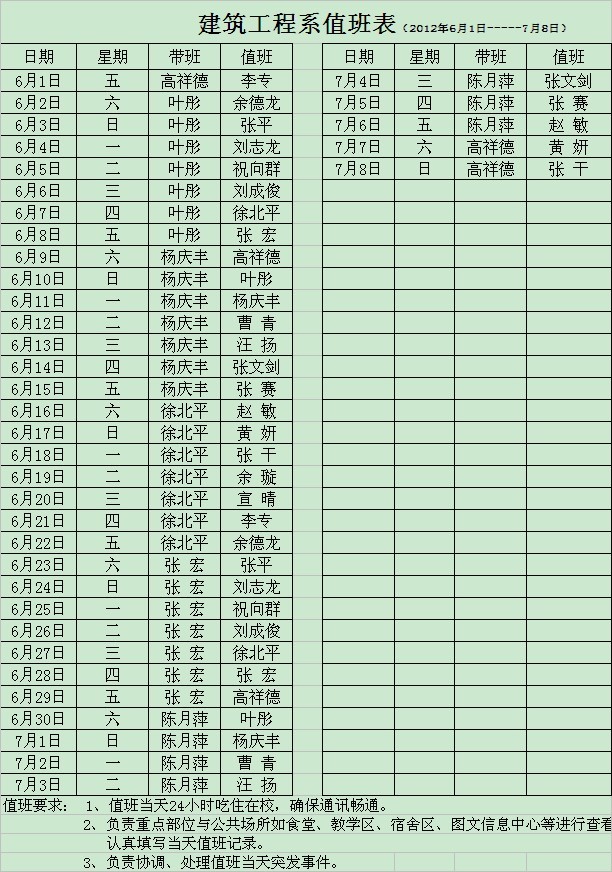 建筑工程系2012年6-7月值班安排表