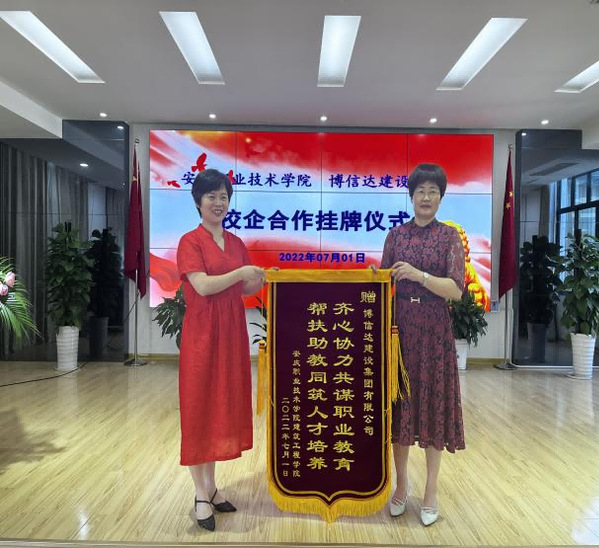 毕明生与汪贤勇共同为“国家职业教育教师教学创新团队实践教育基地”、“taptap点点官方网站建筑工程学院技能人才实习就业基地”、“博信达建设集团有限公司优秀人才培养基地”、“博信达建设集团有限公司员工培训基地”揭牌;校企双方代表互赠锦旗,表示将依托2022级市政工程技术专业,继续开展“订单班”培养模式,携手并进深化合作,互惠双赢共谋发展。