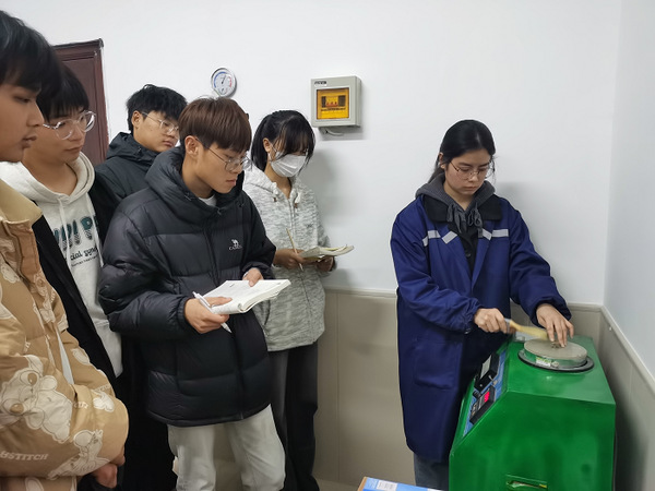 实训教学按照细分子模块,在各个专业实验室分组轮流进行,利用来自在建工程的各类检测材料,严格按照行业标准与规范,分别由11位企业实验师手把手的示范指导,学生一一动手操作完成。来自 24 级建工 1 班的琬玉同学在操作完钢筋抗拉试验后兴奋的说:“刚开始,我看企业指导老师给钢筋加拉力时躲得远远的,害怕听到钢筋崩断的声音,等到自己上手操作,周围有老师和同学的帮助,仪器设备上还有防护网,就一点不害怕了”。在水泥细度试验室,校内授课教师方锐说:“我也是第一次面对真实工程项目对水泥进行细度分析,心里还有点紧张,幸好来之前做了充足准备,看来到企业现场来上实训课备课要求更高。”