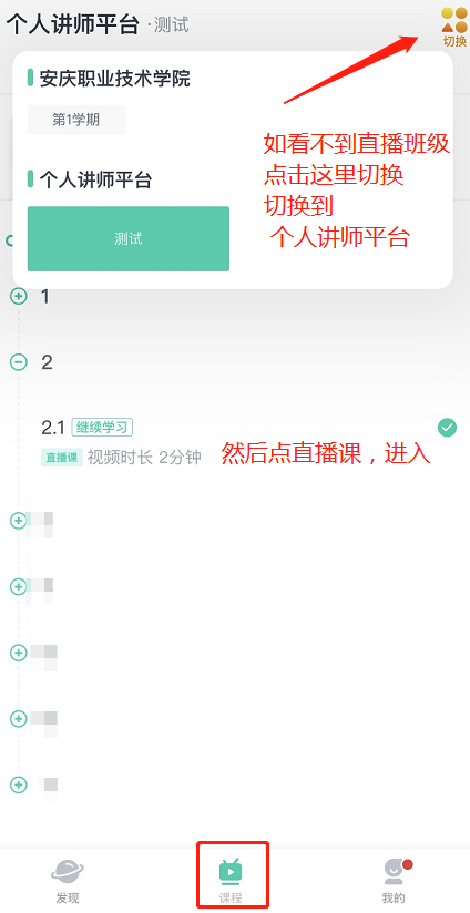 如果有课程按钮,但看不到直播课。点击右上角的切换按钮,切换至个人讲师平台。
