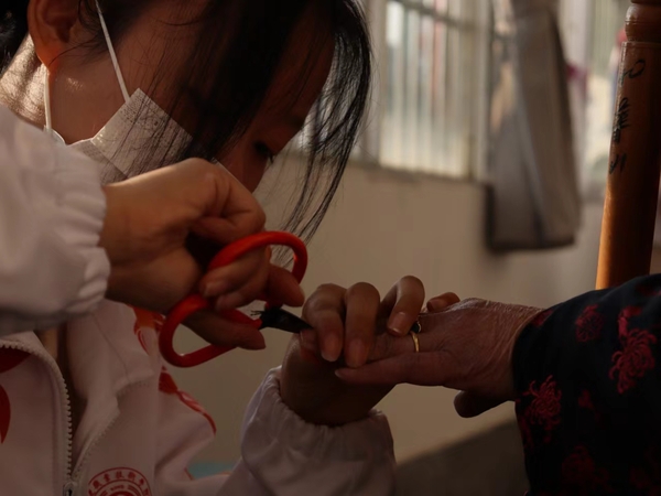 在养老院,师生与老人们亲切交流,关心他们的生活状况和身体状况,积极分子们积极主动帮助老人们修剪指甲、陪他们聊天......学生的到来,让养老院瞬间热闹起来,老人们的笑意也爬上了脸庞。此外,学生还为老人们表演了丰富多彩的文艺节目,如拉丁舞、健康手指操、相声表演等,他们用艺术的方式将温暖、爱心、快乐传递给老人。