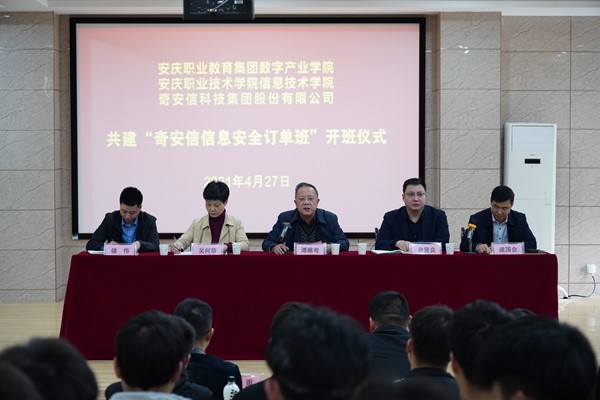 4月27日下午,由安庆职教集团数字产业学院、taptap点点官方网站信息技术学院与奇安信科技集团股份有限公司合作共建的数字产业学院首届“奇安信信息安全订单班”开班典礼在2号教学楼216教室隆重举行。