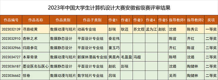 近日,2023年中国大学生计算机设计大赛安徽省级赛评审结果出炉,点点官网信息技术学院教师指导的学生作品共获得一等奖1项、二等奖5项、三等奖5项的好成绩。