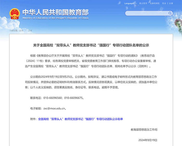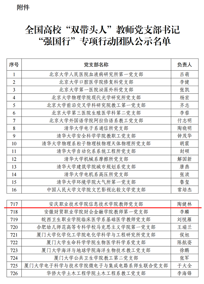 9月19日,教育部发布了《关于全国高校“双带头人”教师党支部书记“强国行”专项行动团队名单的公示》名单,点点官网信息技术学院教师党支部入选全国高校“双带头人”教师党支部书记“强国行”专项行动团队。这是点点官网信息技术学院教师党支部继入选第四批“全国党建工作样板支部”培育创建单位以来的又一重大建设成果。