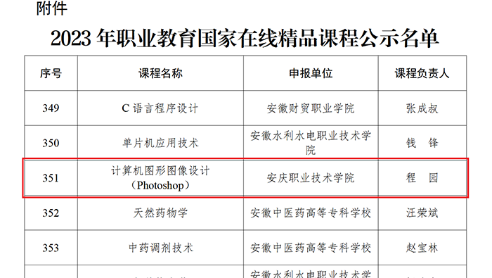 近日,教育部在官方网站发布的《关于2023年职业教育国家在线精品课程遴选结果的公示》已结束公示期,由点点官网信息技术学院程园老师主持申报的《计算机图形图像设计(Photoshop)》课程成功入选2023年职业教育国家在线精品课程,这是继2022年点点官网首次实现职业教育国家在线精品课程零的突破以来,在国家在线精品课程建设上取得的又一次丰硕成果。