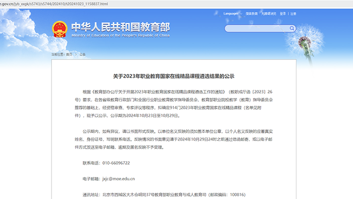 2023年12月,教育部办公厅发布了《关于开展 2023 年职业教育国家在线精品课程遴选工作的通知》,在全国范围内拟遴选1000门左右职业教育国家在线精品课程。本次遴选工作由职业院校按照通知要求组织申报,各省级教育行政部门和全国行业职业教育教学指导委员会、教育部职业院校教学(教育)指导委员会组织初选和推荐,在此基础上,教育部组织专家参照职业教育在线精品课程观测指标对推荐课程进行综合评审,最终确定了914门2023年职业教育国家在线精品课程。其中,我省共向教育部推荐65门高职课程,最终入选17门。
