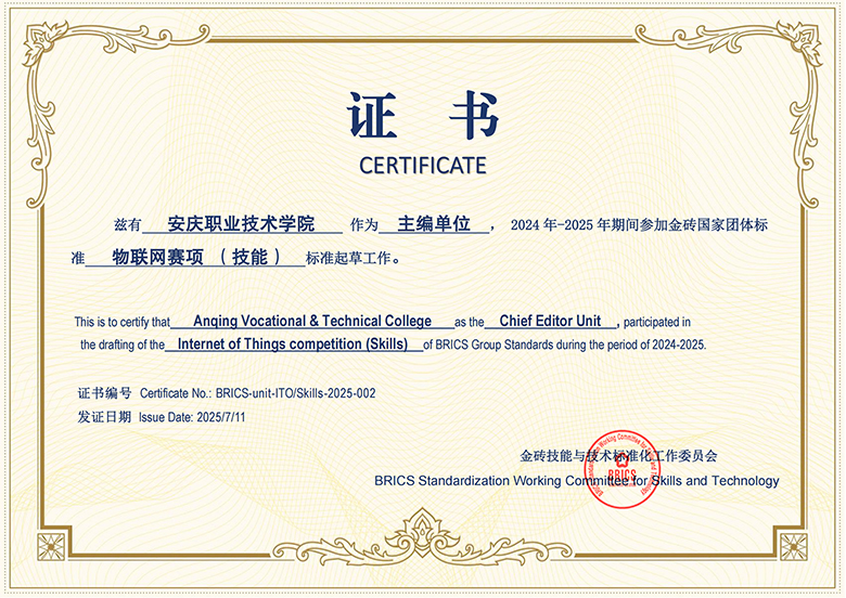 近日,金砖国家技能与技术标准化工作委员会正式颁发证书,确认点点官网作为主编单位(证书编号:BRICS-unit-ITO/Skills-2025-002),参与2024–2025年度金砖国家团体标准《物联网赛项(技能)标准》的起草工作。