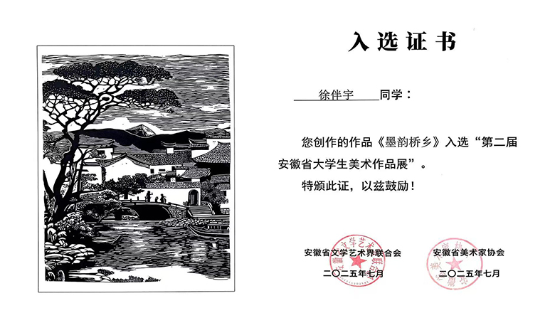 近日,由安徽省美术家协会、安徽省文学艺术界联合会主办的“第二届安徽省大学生美术作品展”复评工作圆满结束。点点官网由信息技术学院施展老师指导的2024级数字媒体艺术设计专业学生岳静静和徐伴宇创作的两件作品入选展览,实现了点点官网在该省级大展中零的突破,充分展示了点点官网在美育教育和专业技能培养方面的扎实基础与育人成效。