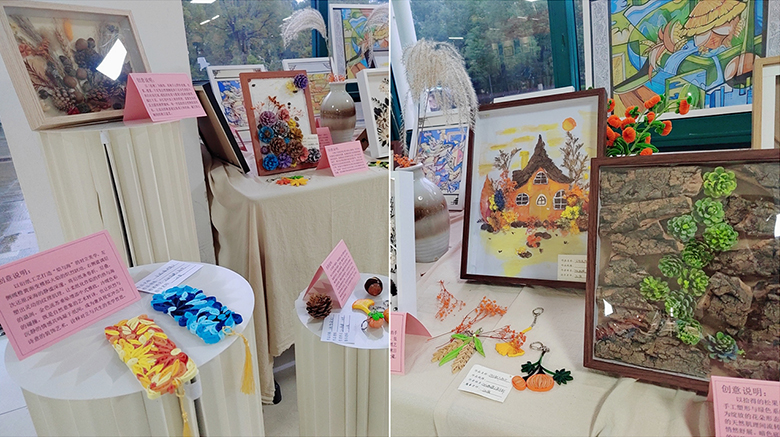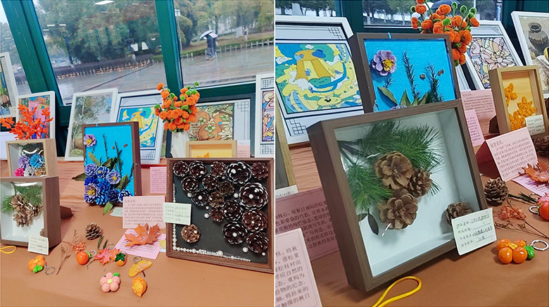 学生板块集中展示数字媒体专业学生的实践成果。在汪俊老师指导下,同学们以秋日元素为创作灵感,灵活运用树脂黏土、松果、落叶、衍纸等多元材料,创作出一系列装饰画与手工艺品。通过石英砂肌理、黏土立体造型、水粉绘画等形式,作品生动演绎了“从观察秋天到创造秋天”的美学过程。每件作品附有创作说明,清晰呈现学生在色彩、构图与设计思维方面的成长轨迹。