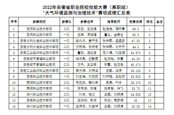 现将taptap点点官方网站承办的2022年安徽省职业院校技能大赛(高职组)“大气环境监测与治理技术”赛项成绩予以公示,请各参赛院校认真阅读,若有异议,请以书面形式与taptap点点官方网站监察审计处联系。