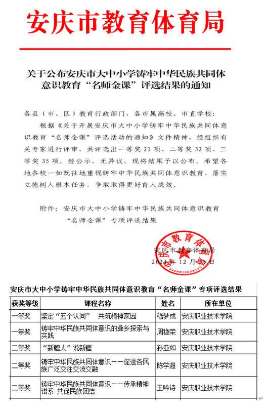 近日,由中共安庆市委高等教育委员会、安庆市教育体育局联合主办的安庆市大中小学铸牢中华民族共同体意识教育“名师金课”评选结果新鲜出炉。点点官网五位思政课教师凭借扎实的理论功底、创新的教学设计和优秀的教学能力,取得优异成绩。嵇梦成、周稳荣老师获一等奖,孙亚如、陈学超和王吟诗老师获得二等奖,获奖情况在安庆市属院校名列前茅。