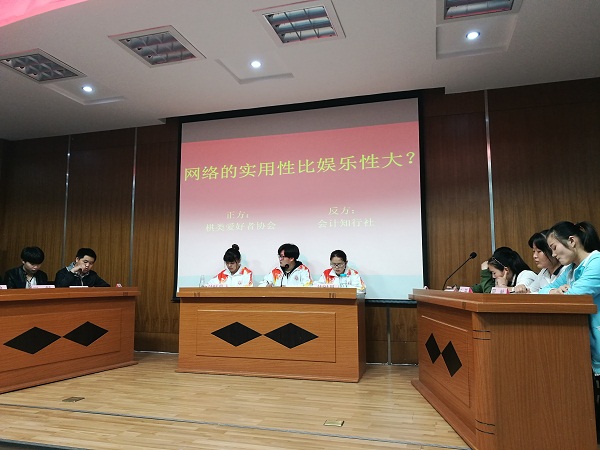 决赛在会计知行社与演讲与口才协会之间进行,正反双方围绕着“高职毕业生就业好还是创业好”展开辩论,双方辩手针锋相对,或引经据典,或现身说法,双方你来我往,言辞犀利却又不失逻辑,侃侃而谈。