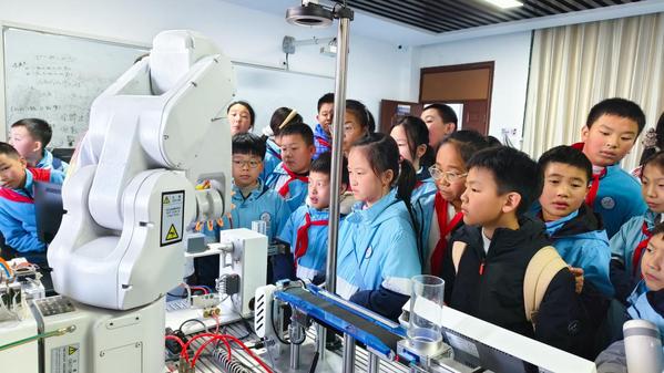 跟随志愿者的脚步,人民路小学五年级5个班的同学们秩序井然地先后走进蝴蝶标本馆、无人驾驶汽车展、3D打印馆、机器人操作展示、幼儿实训室等5个专业特色场馆,开启了一场集标本探索、智能展示、科技体验于一体的科普实践之旅。
