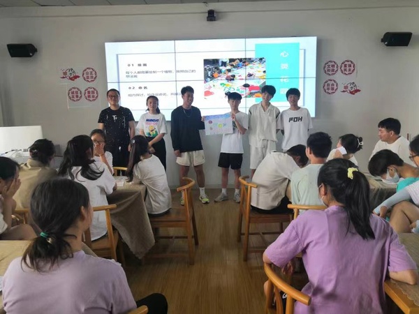 活动伊始,余老师引导同学们根据自己喜欢的颜色分组,大家以植物相约,相知相识并互相交流,共同分享自己最喜欢的植物及寓意。活动第二个环节,余老师带领同学们体验了一场特殊的心理之旅,通过腹式呼吸,辅之意象引导,同学们化身为自己喜欢的植物,想象它们发芽、成长、开花、结果。活动第三个环节,组员合作绘制心灵花园,完善自我认识,提升自我调控能力。最后,余老师从心理学角度分析了同学们在活动中展示自己最喜欢的植物,既是因为同学们被这些植物的优点所吸引,也是因为这些植物的特质与同学们的性格特点有相似之处,投射出了同学们对未来的期望与追求。余老师引导同学们要通过分析不同植物的特点和价值,看到最真实、最独特的自己,正视自己的心理健康,学会悦纳自己。