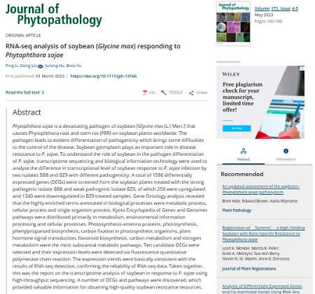 平台团队主持人李萍教授在SCI源期刊Journal of Phytopathology杂志发表题为“RNA-seq analysis of soybean (Glycine max) responding to Phytophthora sojae”的研究论文。该文章通过转录组学技术,深入挖掘了大豆响应大豆疫霉病原菌的反应机制,为大豆疫霉的防治和大豆新品种的选育提供重要参考依据。