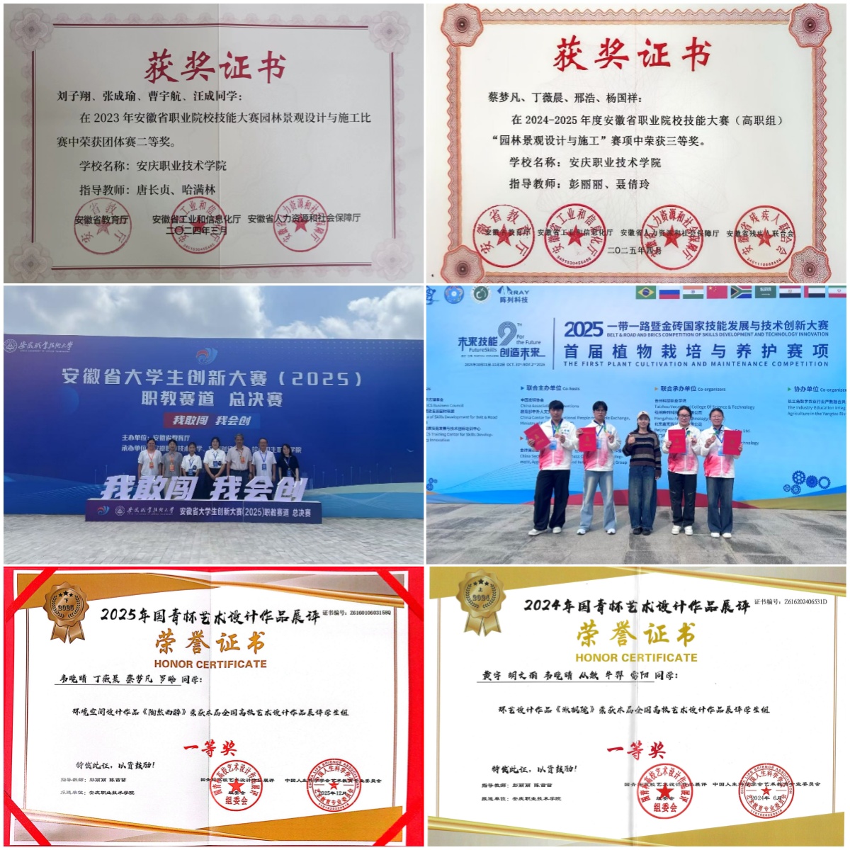 安徽省教学成果二等奖1项;指导学生在园林景观设计与施工、园艺等职业技能大赛、创新大赛、设计大赛等各类大赛中获得国家级奖项12项,省级金奖6项,二三等奖20余项。