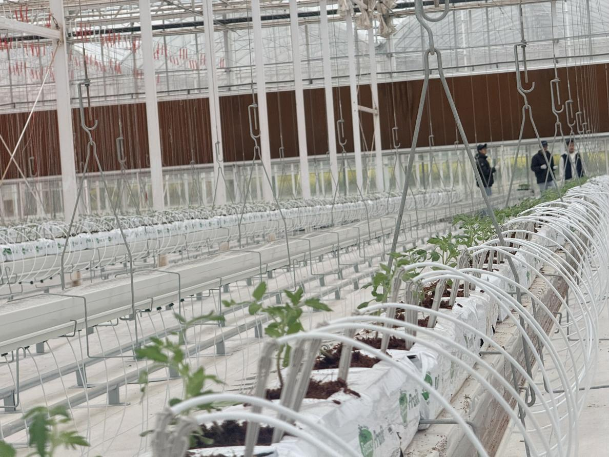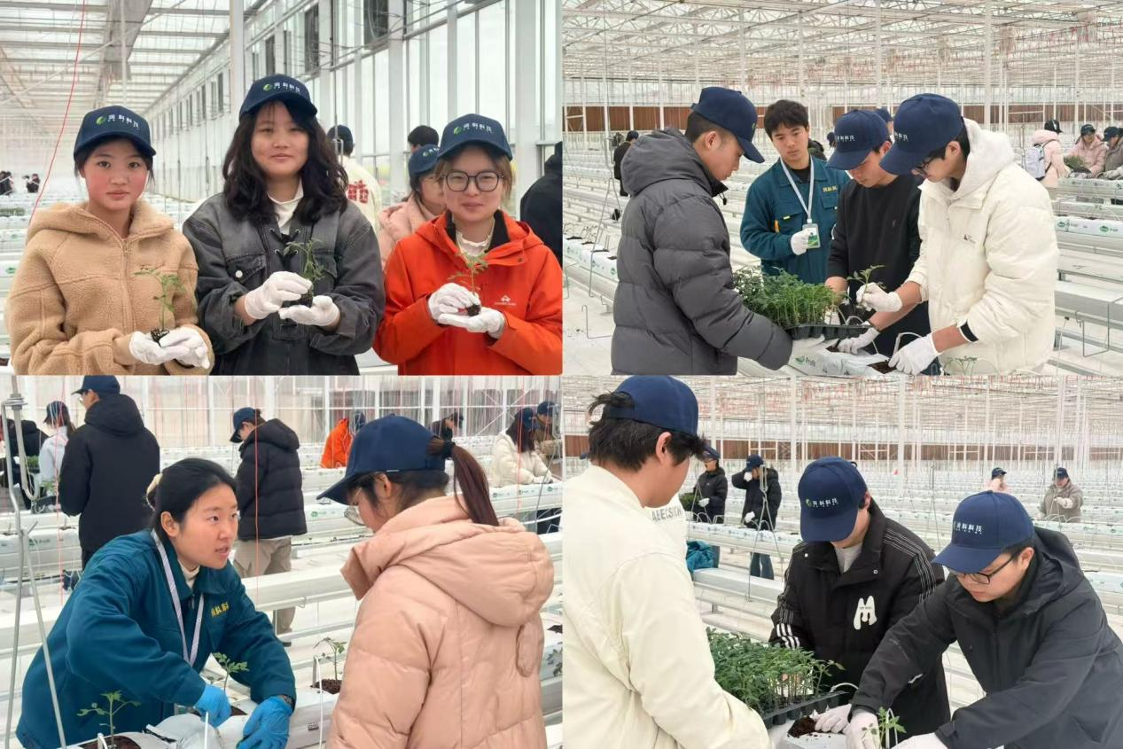 在大棚里,映入眼帘的是整齐排列的种植槽和刚刚铺设好的椰糠基质,正等待着新一批番茄苗的定植。技术员向同学们介绍了大棚内的科技设备,随后开始现场示范番茄苗的定植操作。进入动手实践环节,学生们跃跃欲试。大家2-3人一组、分工协作,小心翼翼地拿起番茄苗,按照技术员示范的步骤,在种植袋上挖孔、放苗、培基质、浇水,亲手种下一株株幼苗。
